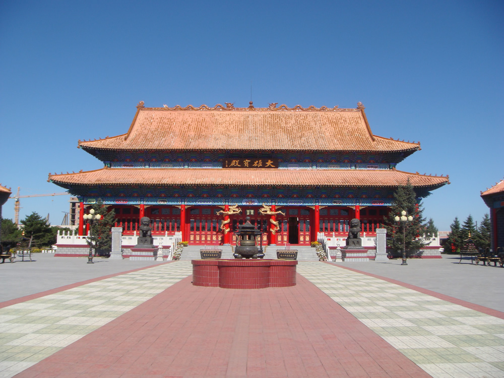 德善佛堂占地面積2.2萬平方米,其中建筑面積 4000平方米,信眾投資800萬元。佛堂西院是宗教區,這是一片雄偉的建筑群,它居高臨下,神秘古樸。二層飛檐斗拱仿古式大紅山門巍峨聳立。一對青色石獅安坐于紅門兩側,守護著山門。步入山門,首先看到兩尊怒目圓睜、體魄精壯、上身裸露,鼓鼻張口的三米高的銅質金剛像(即民間廣為流傳的“哼哈”二將),分立于山門殿東西兩側。往里走,影壁墻上一幅形態生動的彩繪飛天仙女畫像,影壁墻的后面刻滿了“功德芳名”。鐘鼓二樓斗拱飛檐,金碧輝煌,格外引人注目。越過大理石鋪就的廣場,迎面即是大雄寶殿,寶殿的金黃色琉璃瓦脊上,兩條琉璃龍形態逼真生動。大雄寶殿為此院的中心建筑,二層飛檐,加之四角上別具一格的“八大斗拱”。使大殿更顯得造型奇偉,整個大殿莊嚴肅穆,拋光銅質的釋迦牟尼等佛像以及二十諸天像安坐于殿內供臺之上,以供人們膜拜瞻仰。每年的正月初一,是彌勒菩薩圣誕日,又因為是一年之始,佛堂全體居士們均身著懺衣參加法會,此時,鐘鼓齊鳴,香煙繚繞,誦經聲、佛號聲此起彼伏。四月初八是浴佛節,六月十九是觀世音菩薩成道日,七月十五是佛歡喜日(也稱盂蘭盆節)。凡逢節日,全堂居士皆身著懺衣,禮佛誦經,以示敬意。平時這里也帶有受戒、放生、講經等大型法事活動。