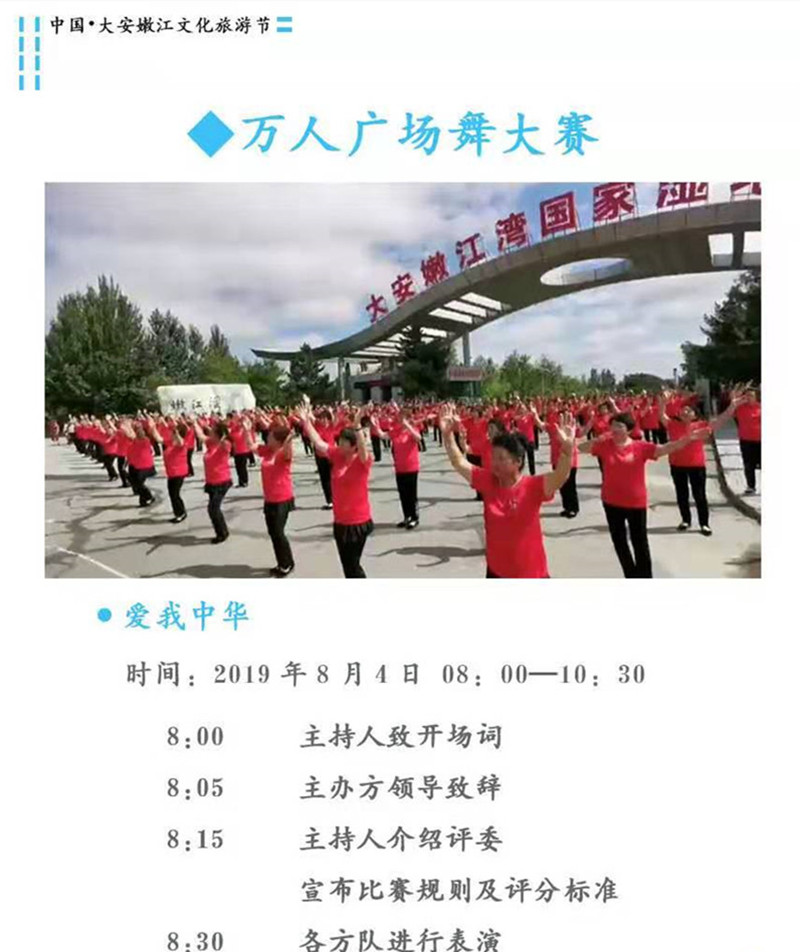 8月4日上午,慶祖國70華誕“愛我中華”萬人廣場舞大賽。“愛我中華”萬人廣場舞大賽,來自我們大安市的12支代表隊,共900余名選手將為我們帶來一場精美震撼的視覺盛宴。