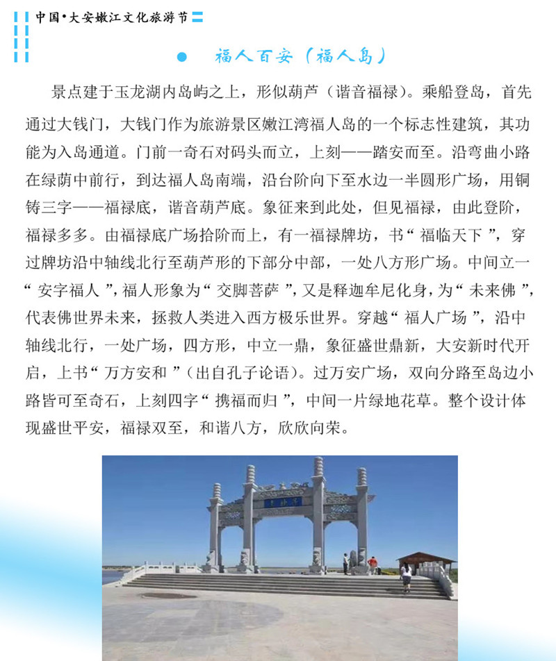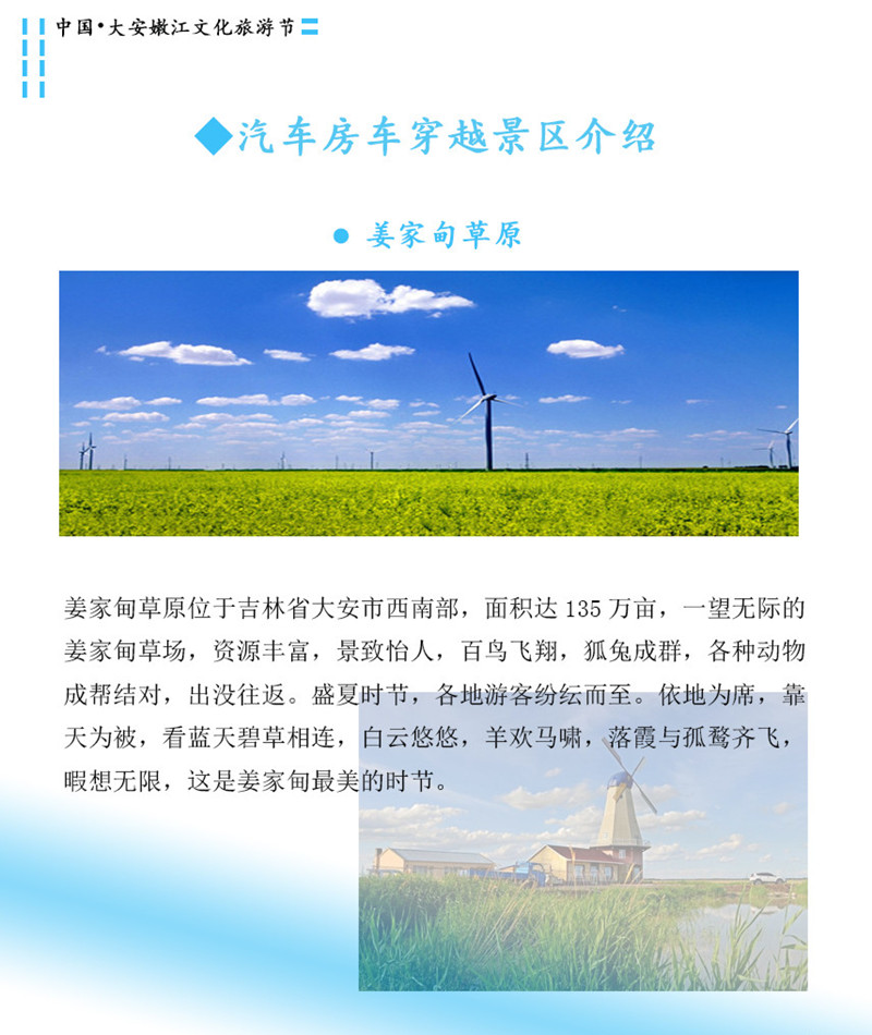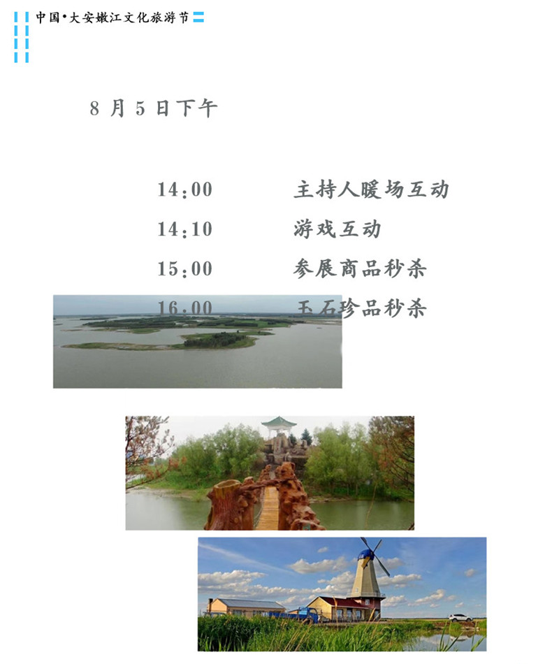 8月3日上午舉辦的嫩江文化旅游節開幕式將通過領導致辭、第一書記代言、文藝節目、公益騎行徒步儀式等活動,著力于振興大安商品經濟,推動旅游產業的發展,同時展示嫩江灣旅游特色與魅力,打造優質旅游品牌。